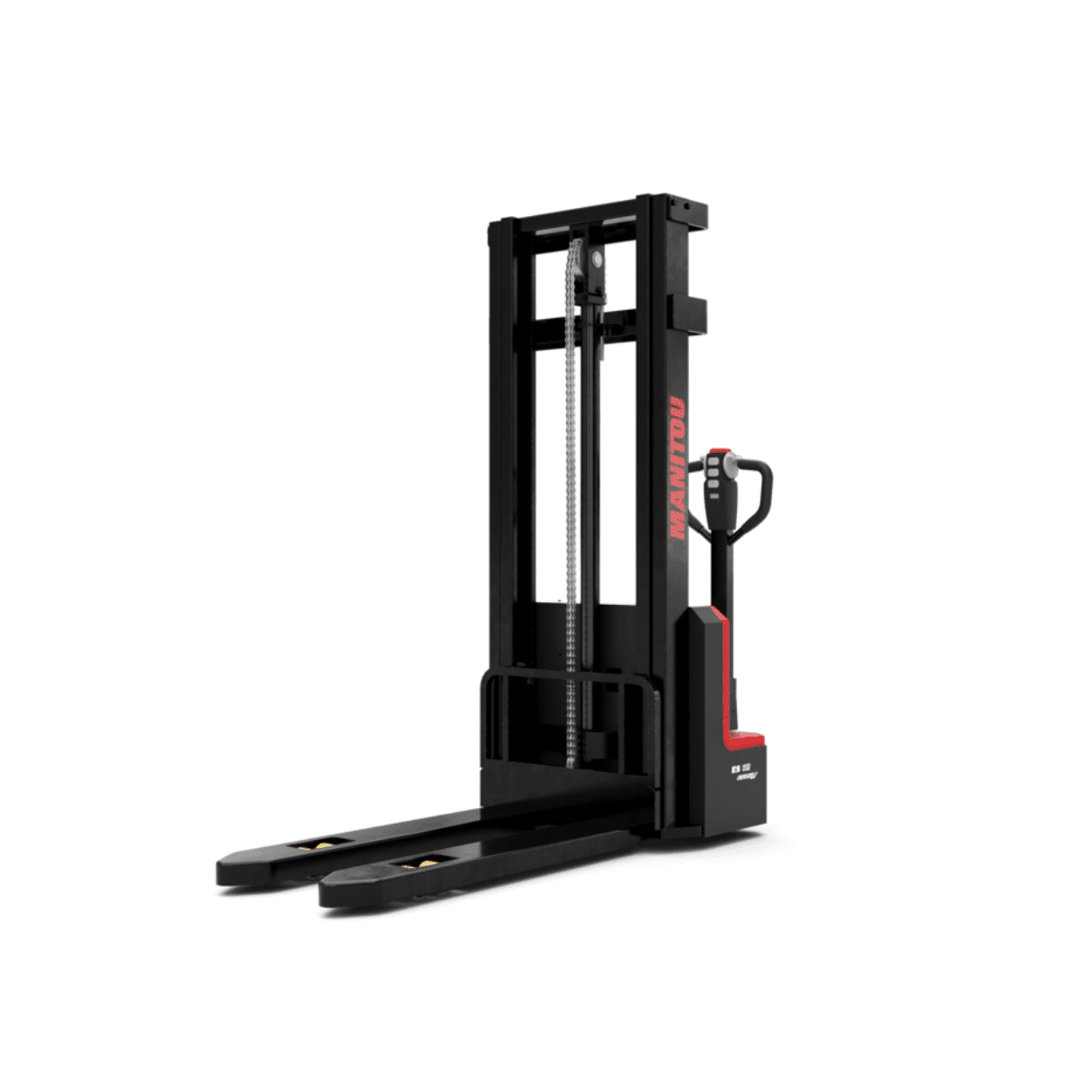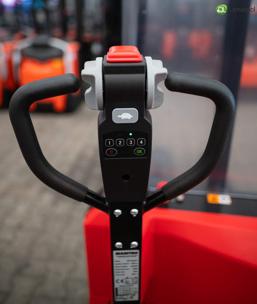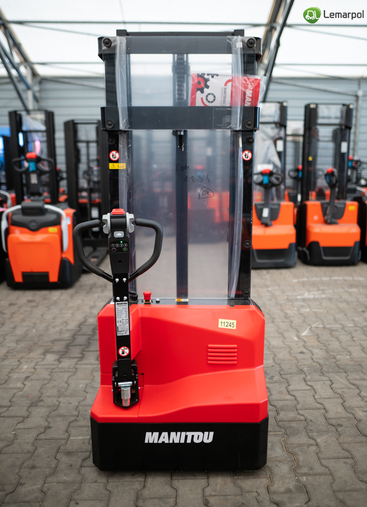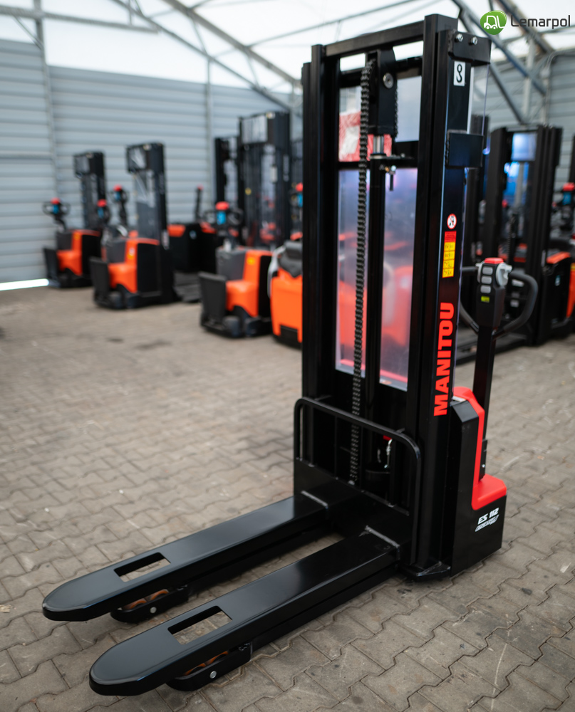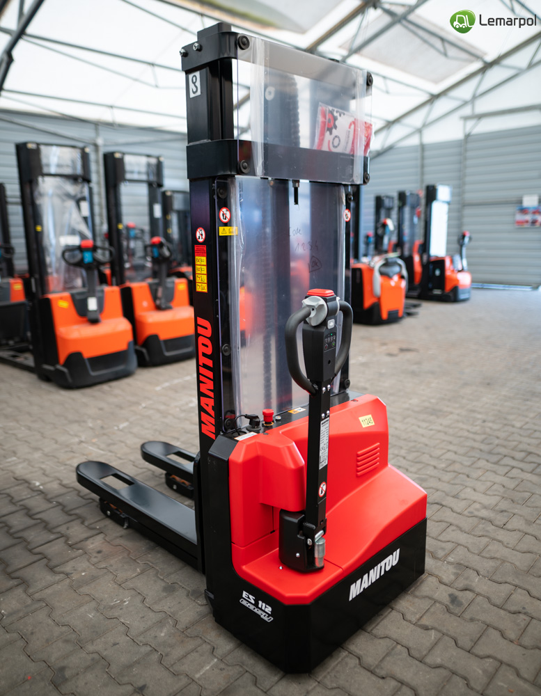 Wózek paletowy elektryczny Manitou ES 112 EASY o maksymalnym udźwigu 1200 kg, wyposażony w akumulator litowo-jonowy i zintegrowaną ładowarkę.